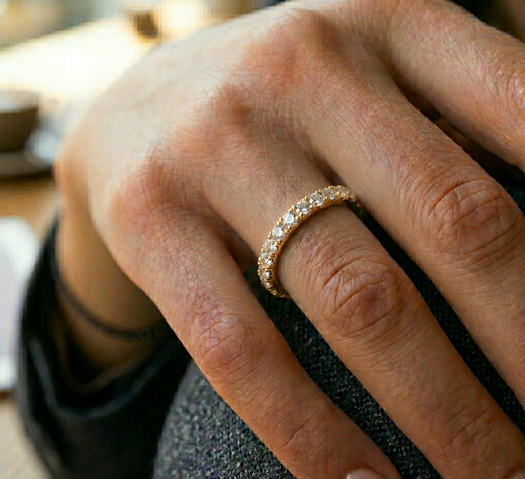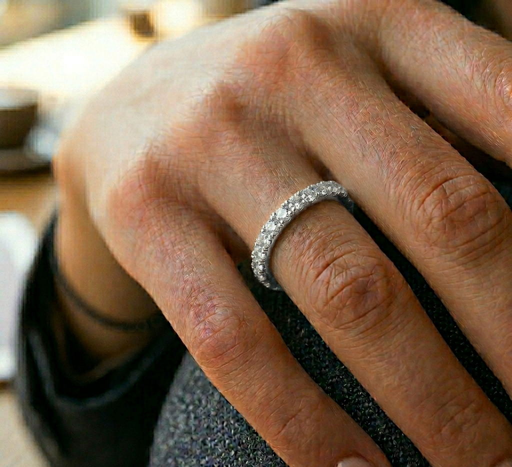 Deimantinė juostelė su laboratoriniais deimantais – žiedas su 0.45 karato deimantais. Nesvarbu, ar jau turite sužadėtuvių žiedą, ar vestuvinį žiedą – juos lengvai derinsite su deimantine juostele, kuri gali būti nešiojama ir kaip papildomas, ir kaip vienintelis žiedas.