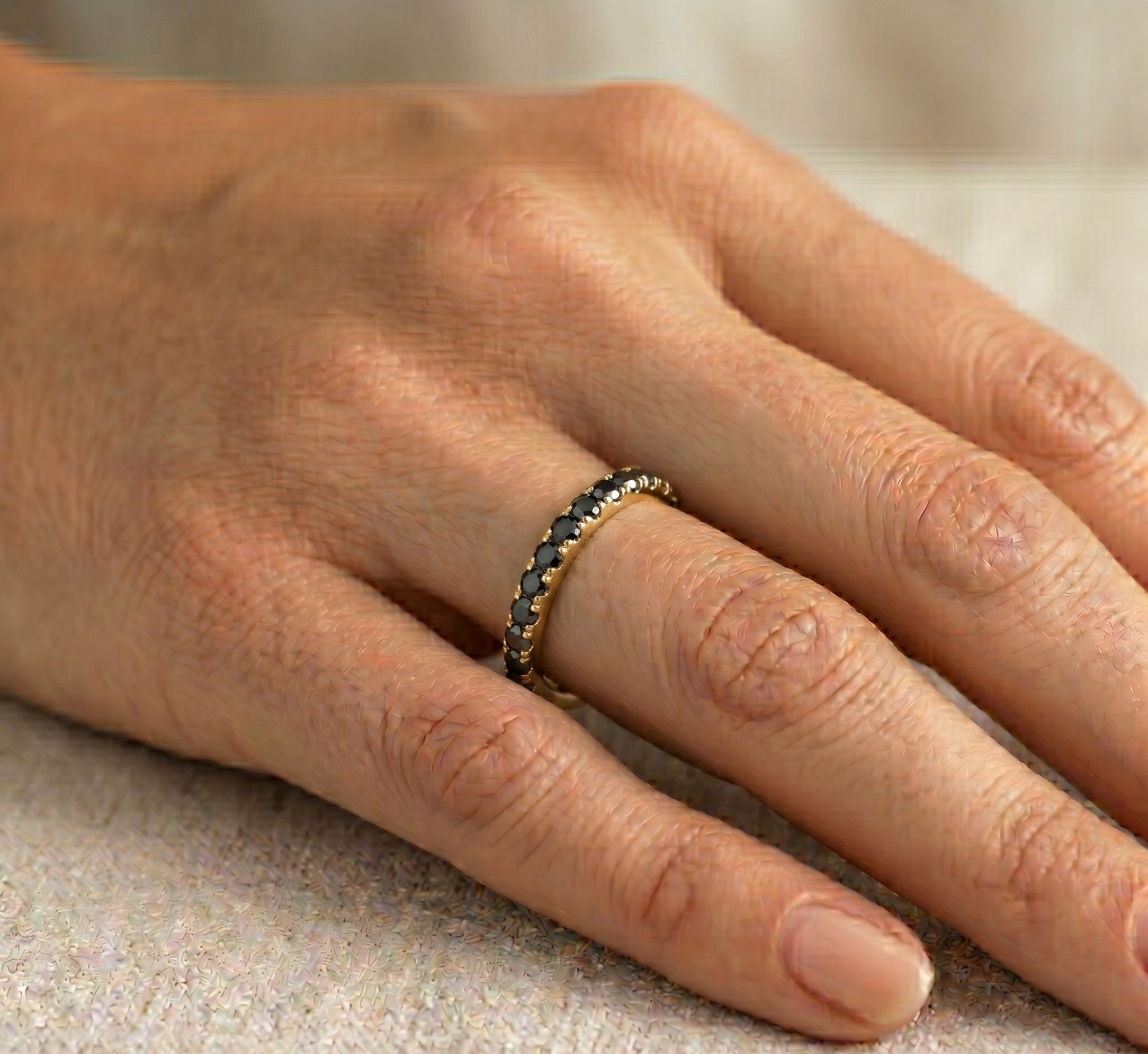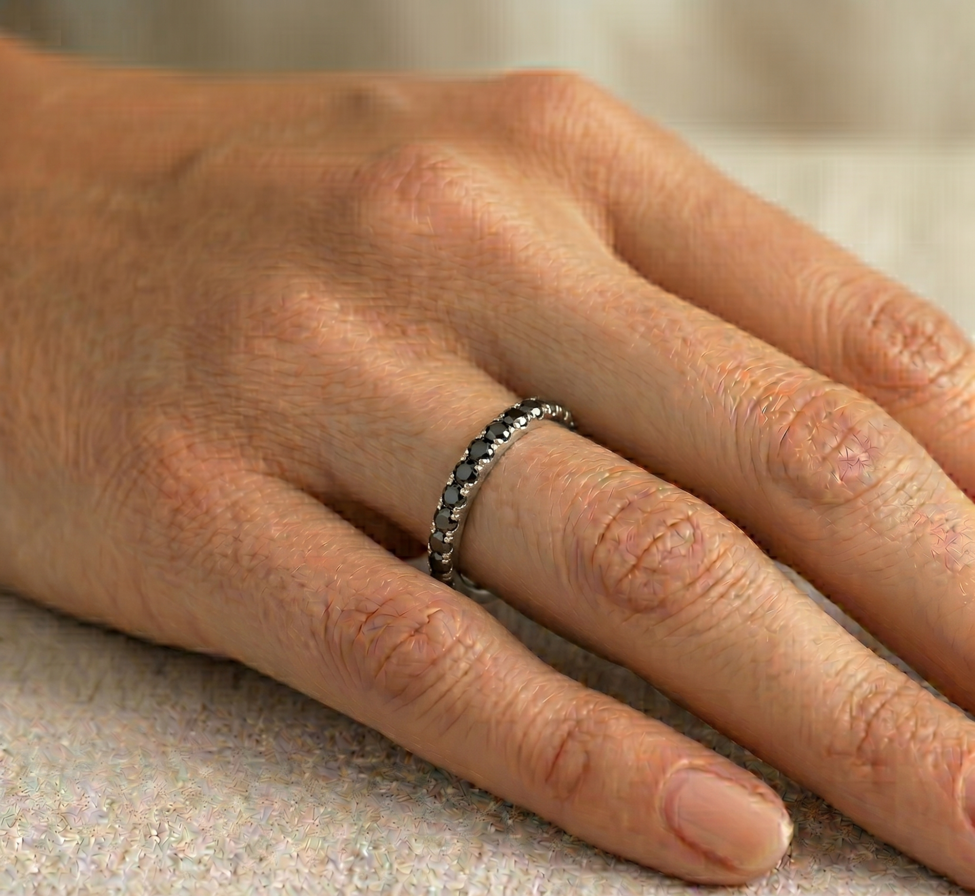 Deimantinė juostelė su juodais deimantais – žiedas su 0.75 karato deimantais. Nesvarbu, ar jau turite sužadėtuvių žiedą, ar vestuvinį žiedą – juos lengvai derinsite su deimantine juostele, kuri gali būti nešiojama ir kaip papildomas, ir kaip vienintelis žiedas.
