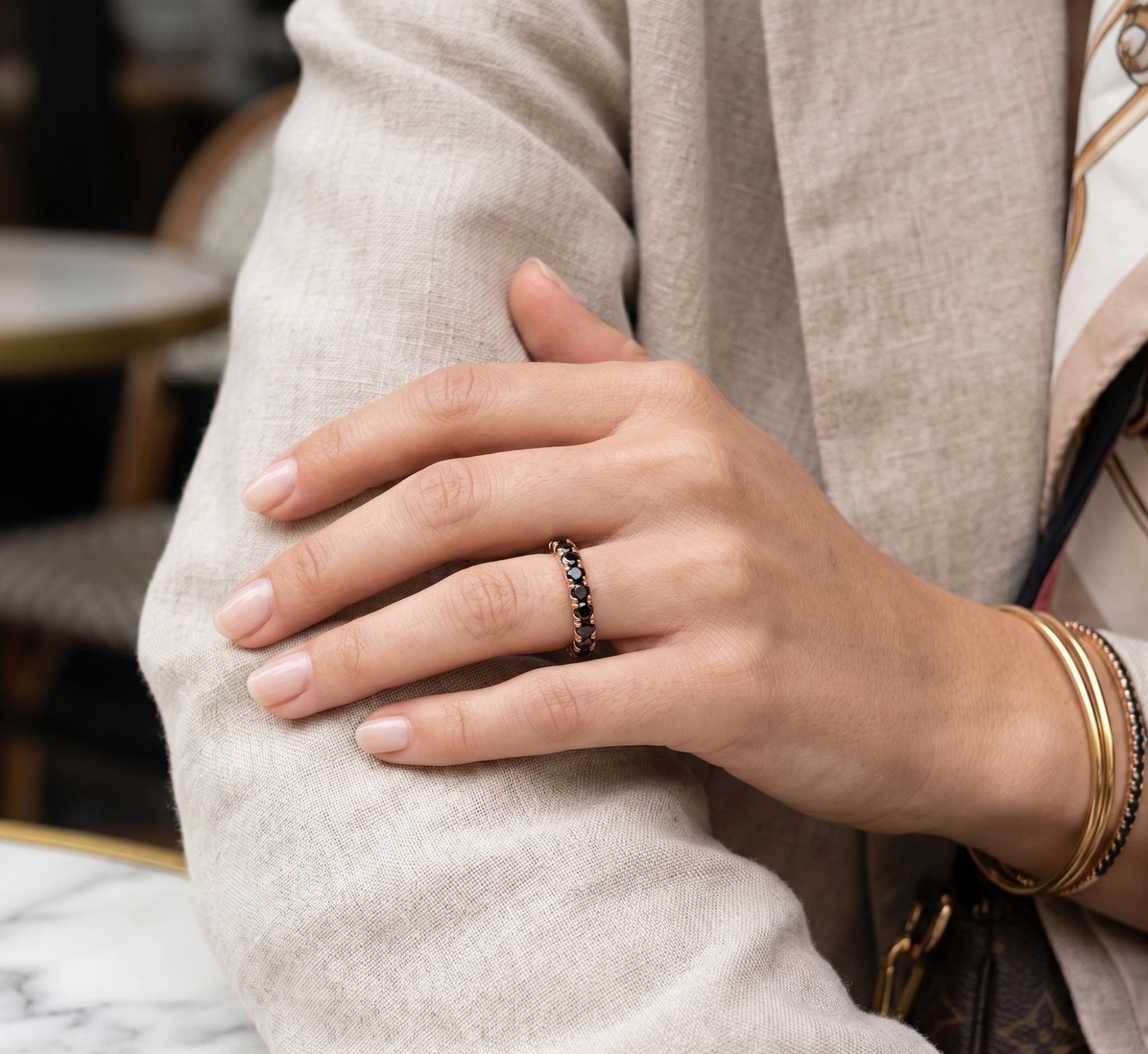 Deimantinė juostelė su juodais deimantais juodo aukso – žiedas su 0.75 karato deimantais. Nesvarbu, ar jau turite sužadėtuvių žiedą, ar vestuvinį žiedą – juos lengvai derinsite su deimantine juostele, kuri gali būti nešiojama ir kaip papildomas, ir kaip vienintelis žiedas.