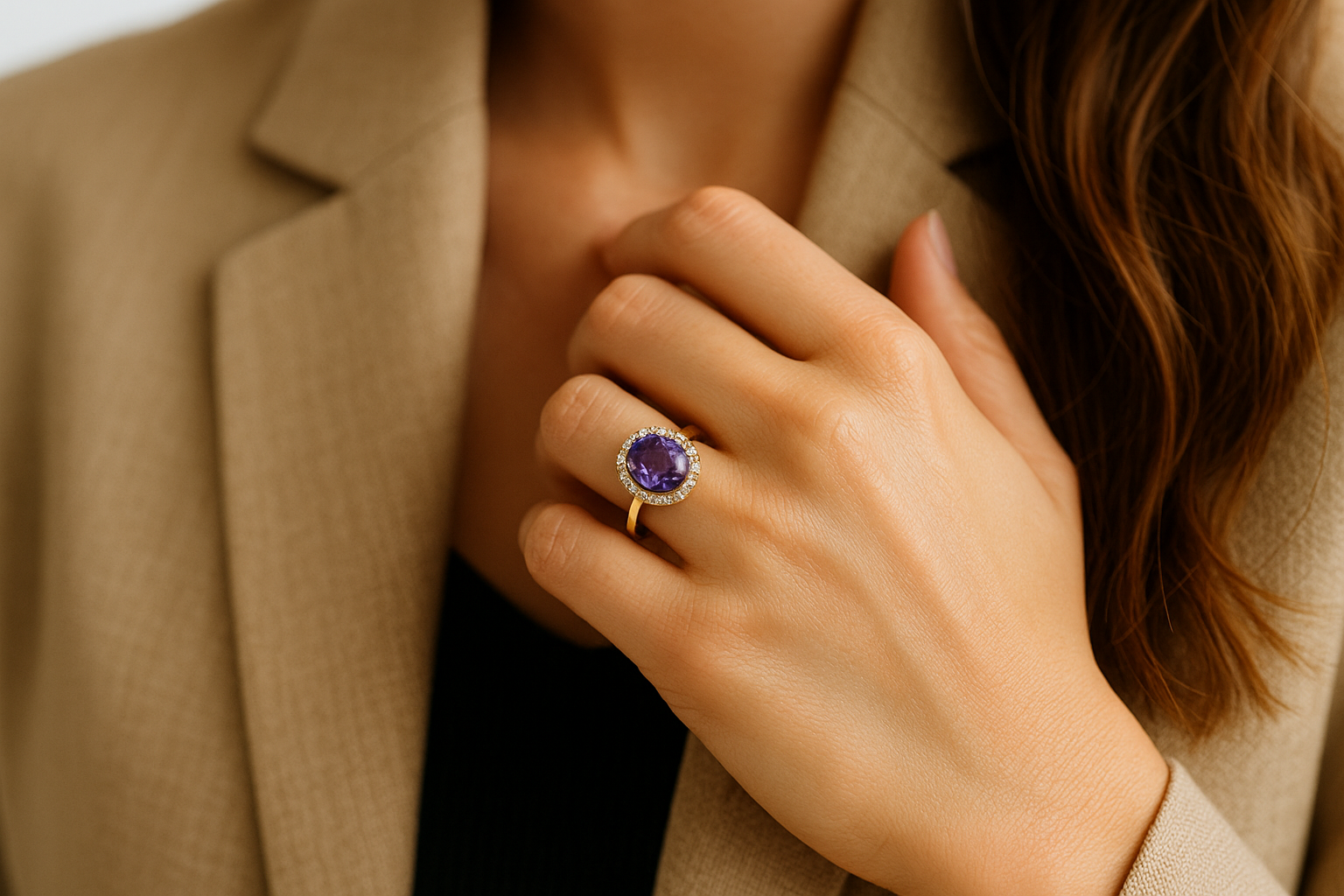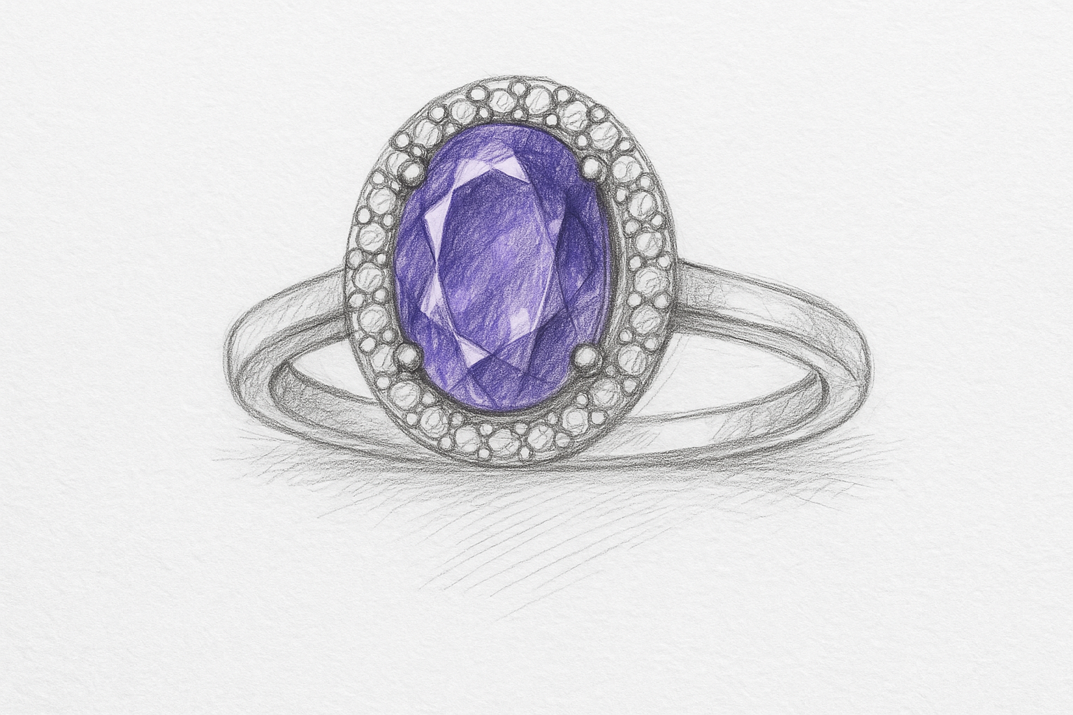 Projektuojant žiedą su ametistu ir deimantais, juvelyras pirmiausia įvertina ametisto savybes – jo violetinę spalvą, skaidrumą, formą ir proporcijas. Būtent pagal konkretų ametisto akmenį kuriamas visas dizainas: karūnėlės aukštis, halo deimantų išdėstymas, plotis ir forma. Kiekvienas žiedas ir kiti papuošalai reikalauja itin kruopštaus ir profesionalaus darbo, leidžiančio pasiekti tobulą balansą tarp estetikos, patogumo ir ilgaamžiškumo.