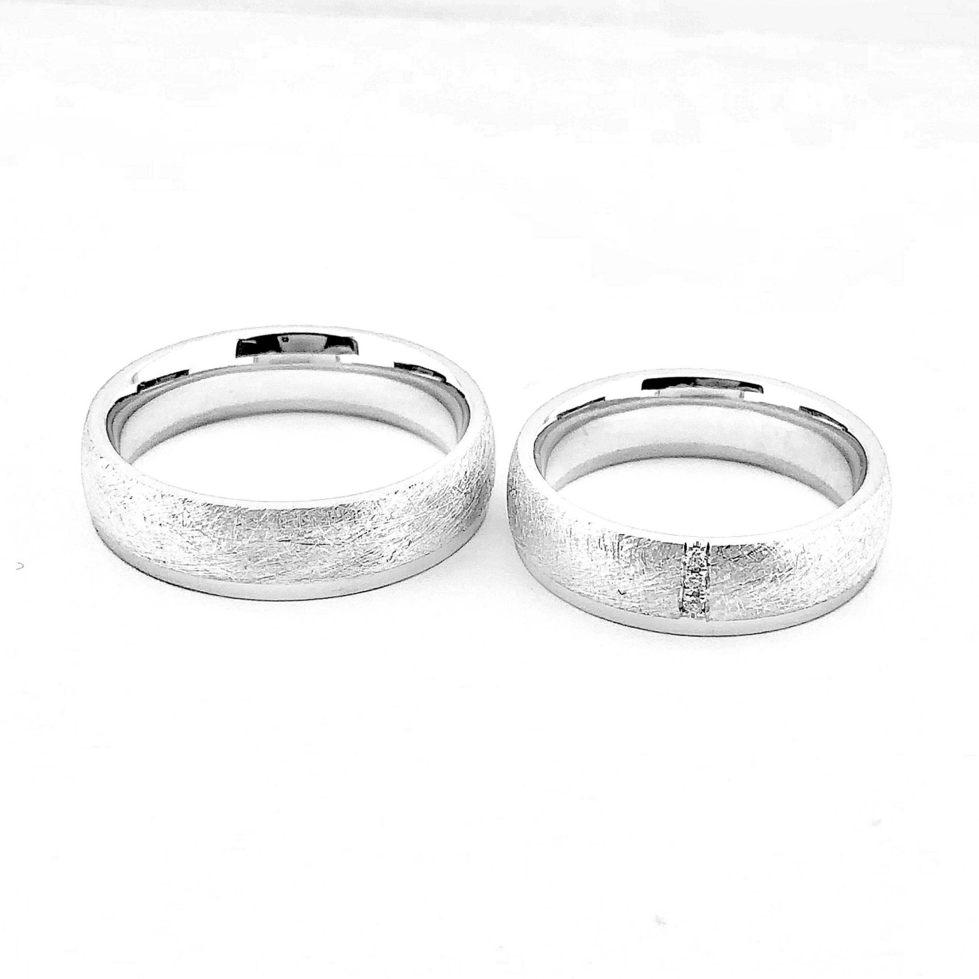Auksiniai vestuviniai žiedai yra populiariausias pasirinkimas. Šis žiedų komplektas žavi matiniu, tarytum apibraižytu paviršiumi. Moteriškas žiedas su briliantais (0,015 ct), suteikiančiais ir taip išskirtiniam žiedui prabangos bei solidumo. Tiks tiem, kurie nenori tradicinių sprendimų.