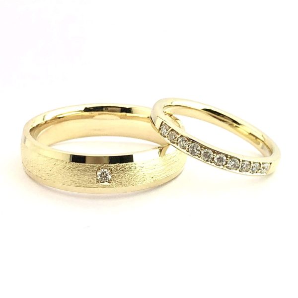 Vestuviniai žiedai, apjungiantys minimalizmo subtilumą ir brangakmenių prabangą. Vyriškas žiedas platus, specialiai sukurto ir ilgai išliekančio grublėto paviršiaus, su briliantu. Moterišką vestuvinį žiedą puošia briliantų juostelė, suteikianti elegancijos, spindesio. Vizualiai skirtingus žiedus vienija brangakmeniai. Gamybos trukmė 14 d.d., galime pagaminti skubos tvarka per 3 d.d.