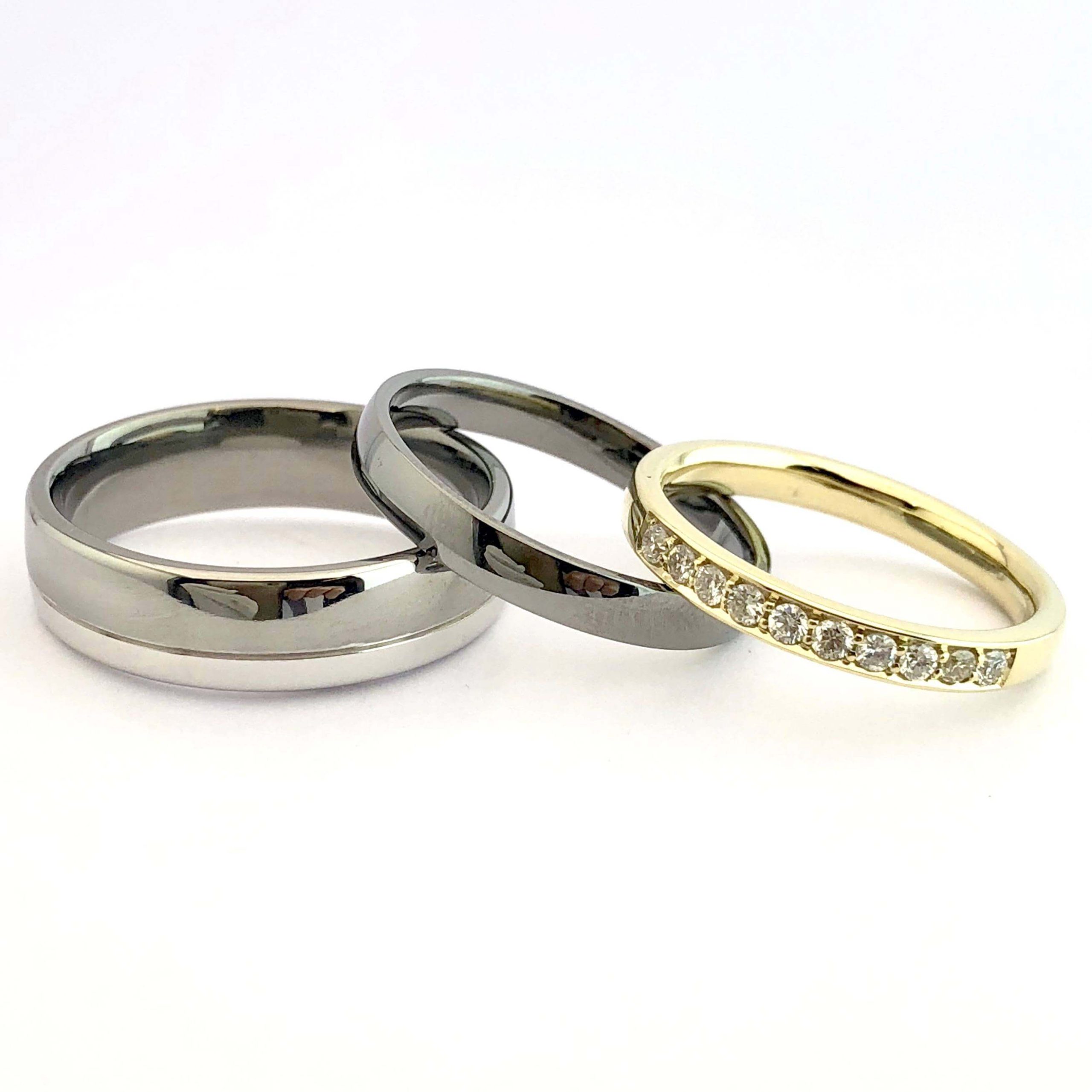 Komplektas, sudarytas iš vestuvinių žiedų poros ir sužadėtuvių žiedo. Kontrastingi, bet jungiami prabangos ir rafinuoto subtilumo. Vestuviniai žiedai labai originalūs, išsiskiriantys juodos spalvos atspalviu bei ypatingu blizgesiu. Geltono aukso sužadėtuvių žiedas su briliantais papuoš kiekvienos moters ranką. Gamybos trukmė 14 d.d., galime pagaminti skubos tvarka per 3 d.d.