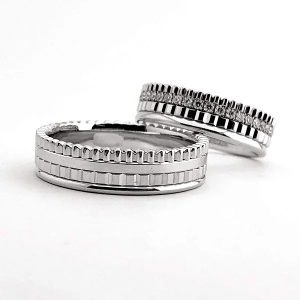Эти обручальные кольца предназначены для тех, кто отказывается от привычных классических, минималистичных решений и выбирает оригинальность! Золотые кольца для Него и для Нее выделяются изысканным дизайном, рельефными элементами, контрастом гладкой и волнистой поверхности. Женское кольцо с бриллиантами (0,45 ct) – роскошь на фоне современного кольца.