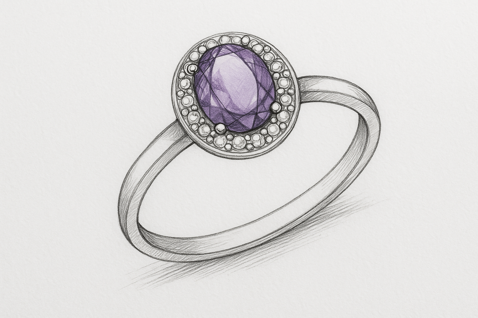 Projektuojant žiedą su ametistu ir deimantiniu lankeliu, juvelyras pirmiausia įvertina ametisto savybes – jo violetinę spalvą, skaidrumą, formą ir proporcijas. Būtent pagal konkretų ametisto akmenį kuriamas visas dizainas: karūnėlės aukštis, halo deimantų išdėstymas, plotis ir forma. Kiekvienas žiedas ir kiti papuošalai reikalauja itin kruopštaus ir profesionalaus darbo, leidžiančio pasiekti tobulą balansą tarp estetikos, patogumo ir ilgaamžiškumo.