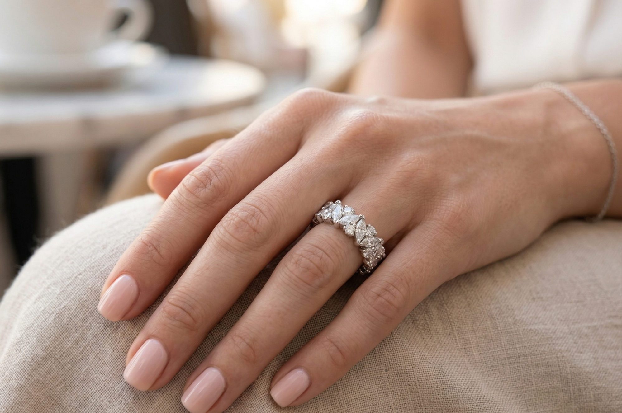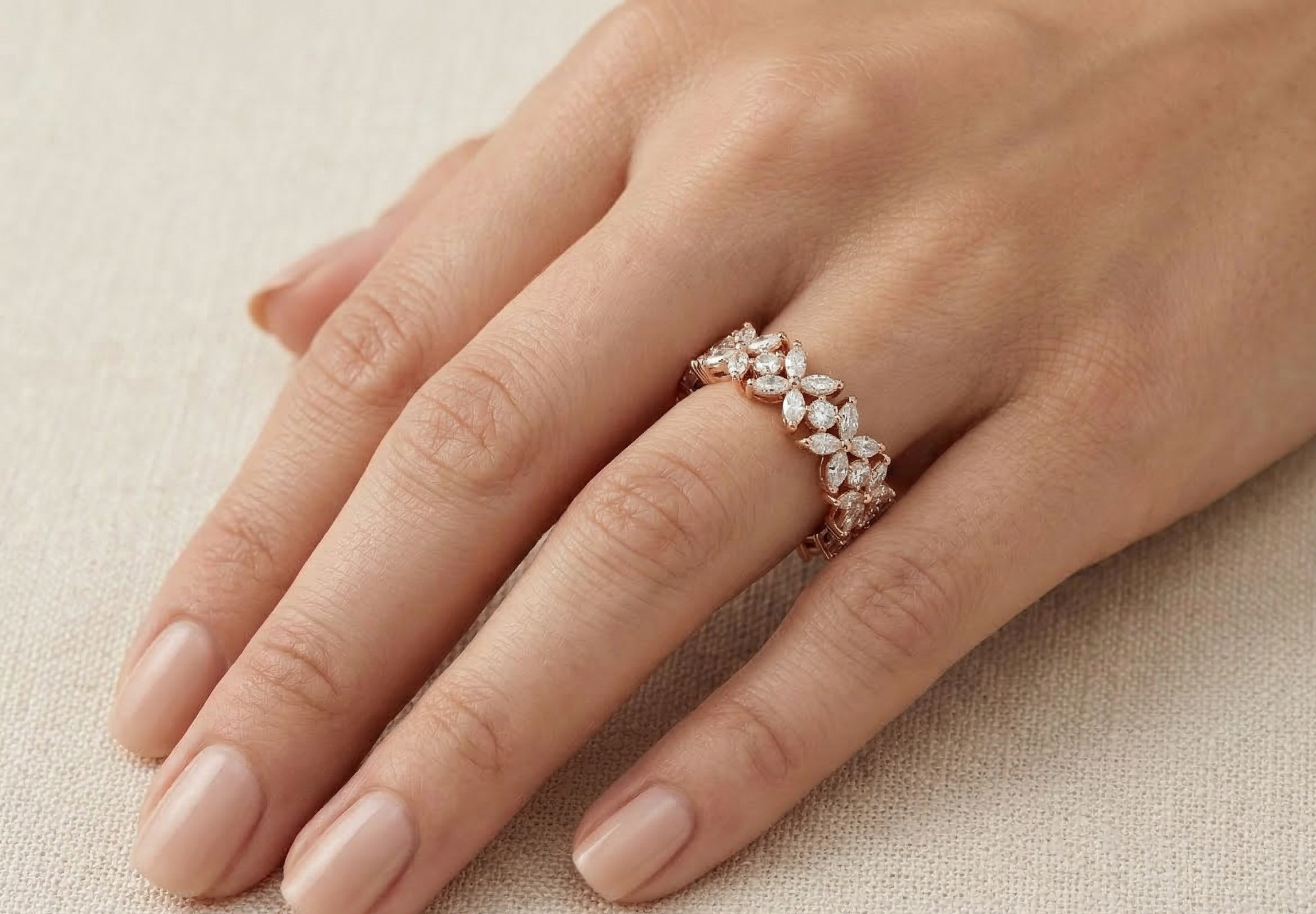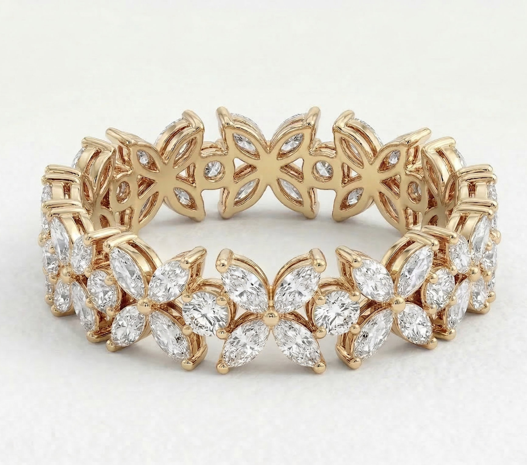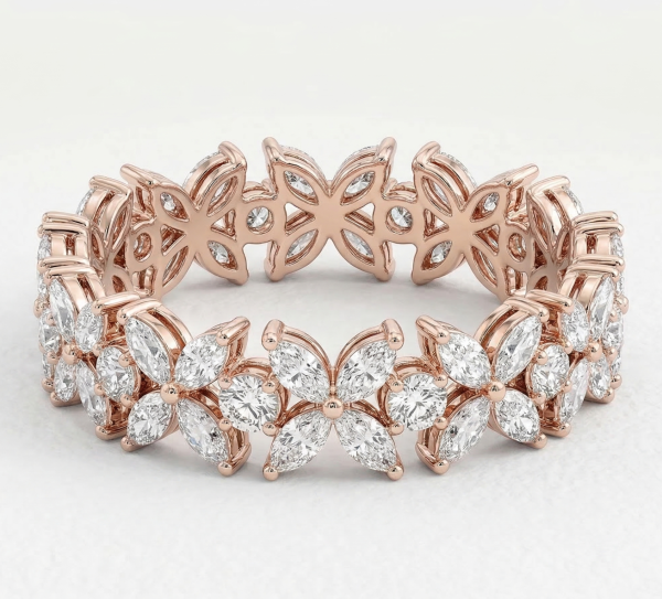 Išskirtinė deimantinė juostelė su 28 markizės ir 7 apvalios formos deimantais – žiedas su 8.90 karato deimantais.