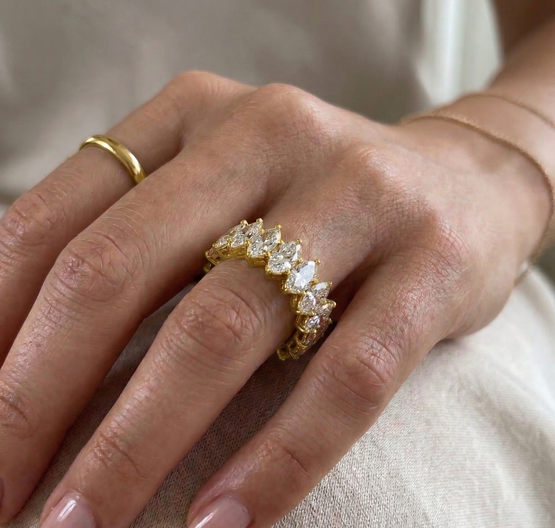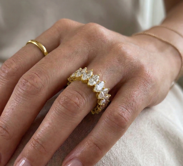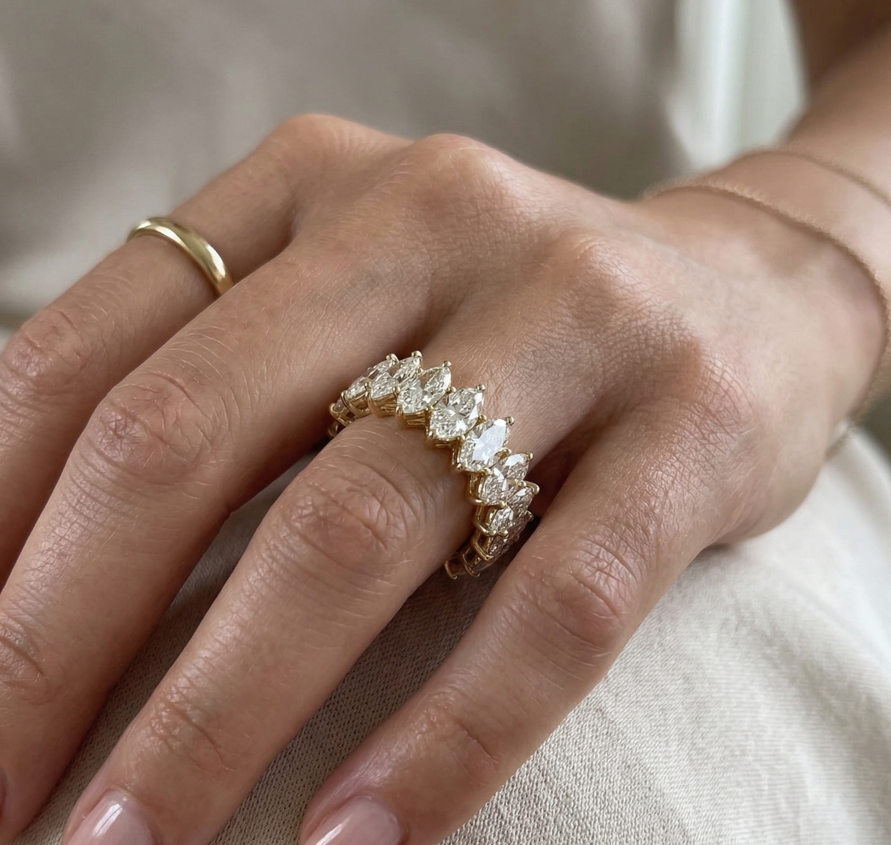 Išskirtinė deimantinė juostelė su 13 markizės formos laboratoriniais deimantais — žiedas su 6.57 karato deimantais. Aukščiausia žiedo kokybė iš Lietuvos. Maksimalus patogumas kasdieniam nešiojimui. Tai išskirtinis pasirinkimas tiems, kurie vertina aukštą kokybę. Pagaminta Lietuvoje — pagal aukščiausius standartus.