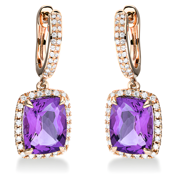 Halo dizaino auksiniai auskarai su anglišku užsiegimu su 4.40 ct ametistais stačiakampio formos ir deimantais aplink ametistą. Tinka kasdienai ir ypatingoms progoms, išskirtinam stiliui.