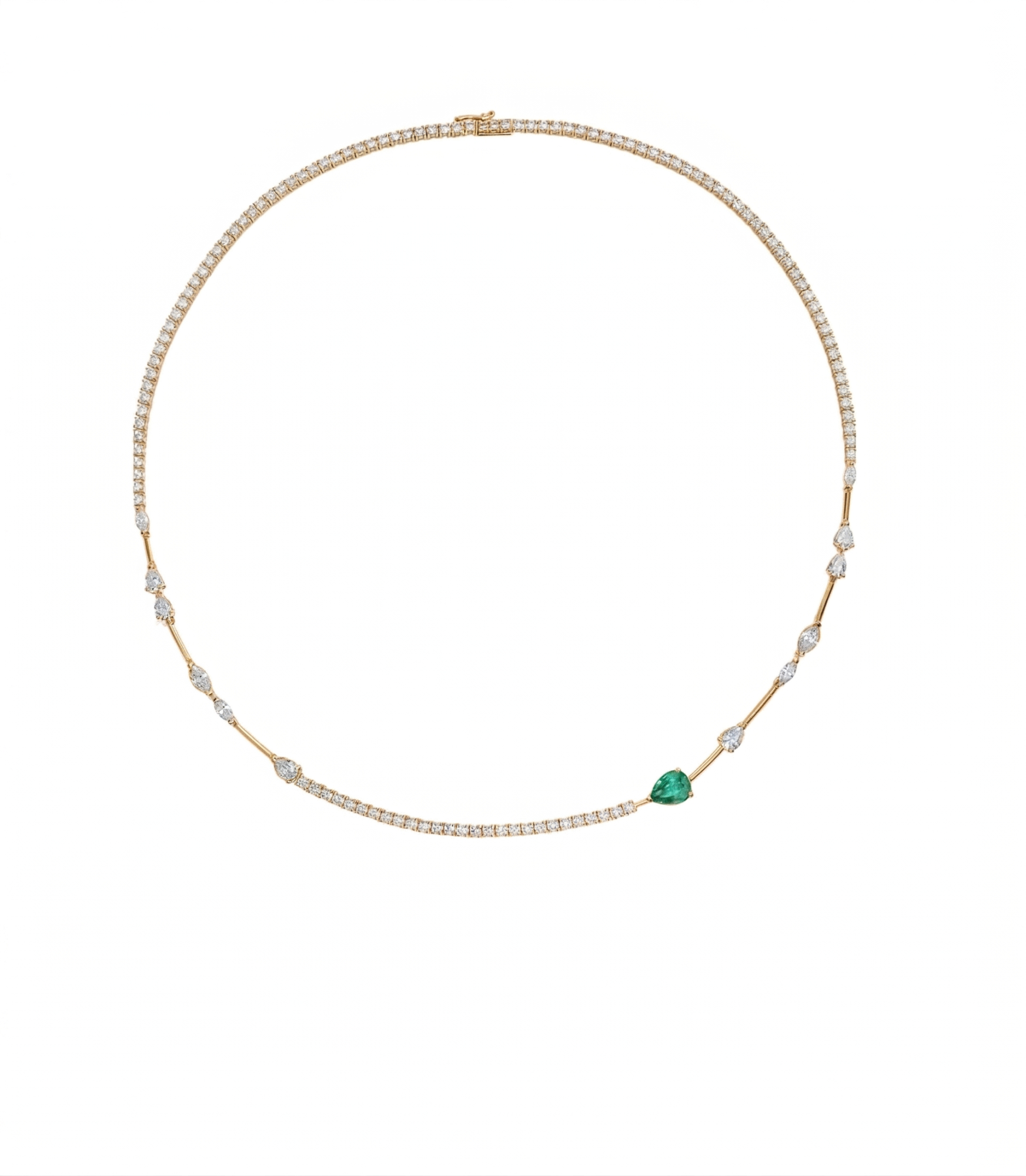 Ši išskirtinė Tennis koljė, pagaminta iš prabangaus 750 aukso prabos, puošta spindinčiais 12.90 ct deimantais ir smaragdu, kurių kiekvienas deimantas yra pagrindinis prabangos ir kokybės akcentas, suteiks elegancijos ir prabangos bet kokiam jūsų įvaizdžiui.