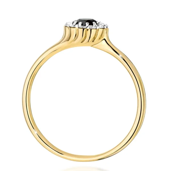 Geltono aukso žiedas, kurio centre spindi juodas deimantas, apsuptas baltų akmenėlių vainiku. Kontrastingas Halo dizainas išryškina unikalų žiedo charakterį ir simbolizuoja paslaptingą, bet tvirtą meilę.