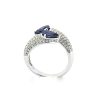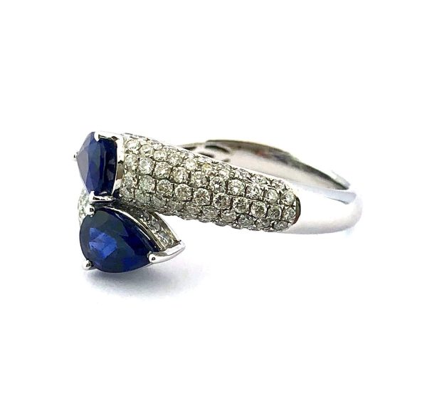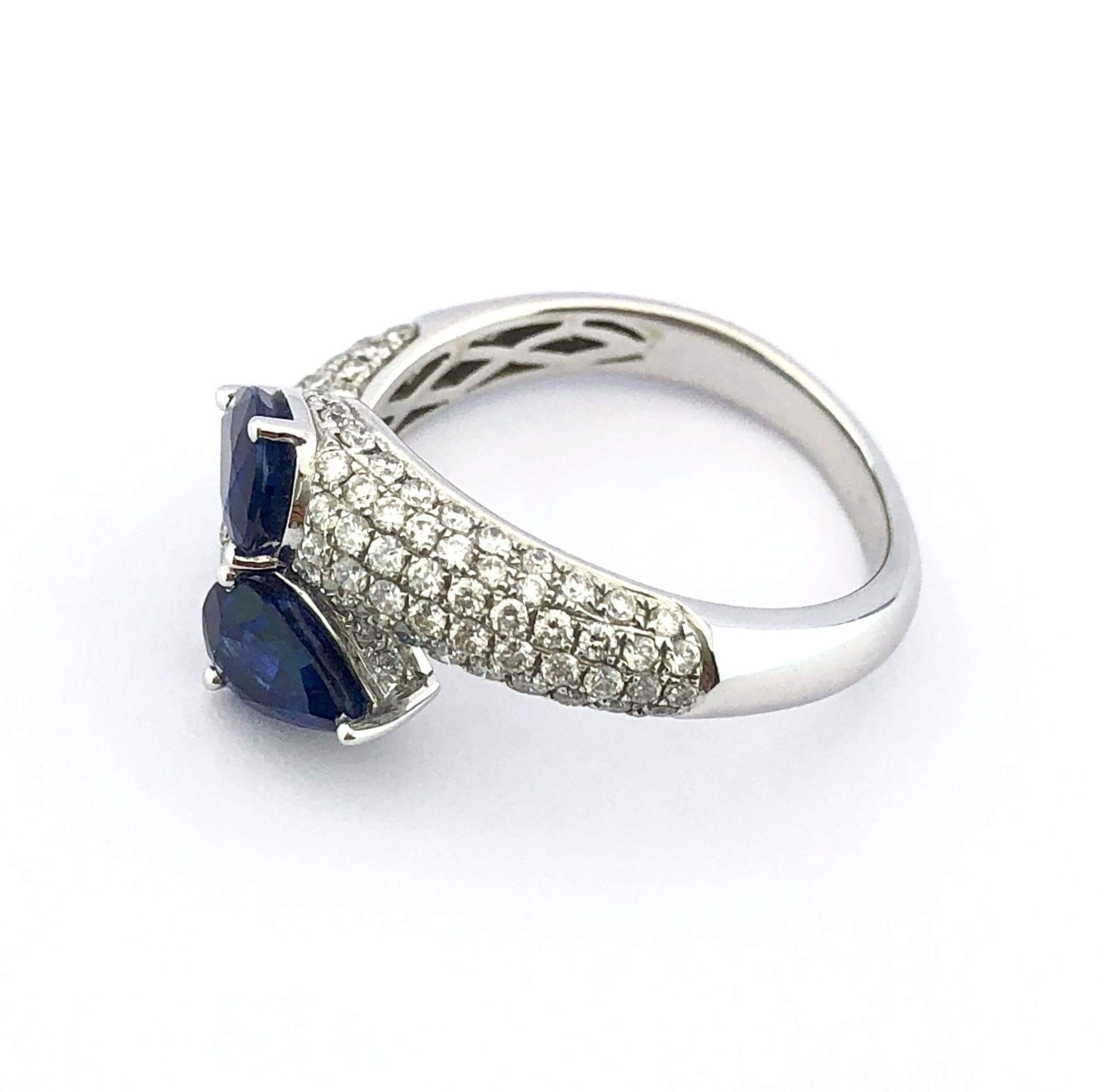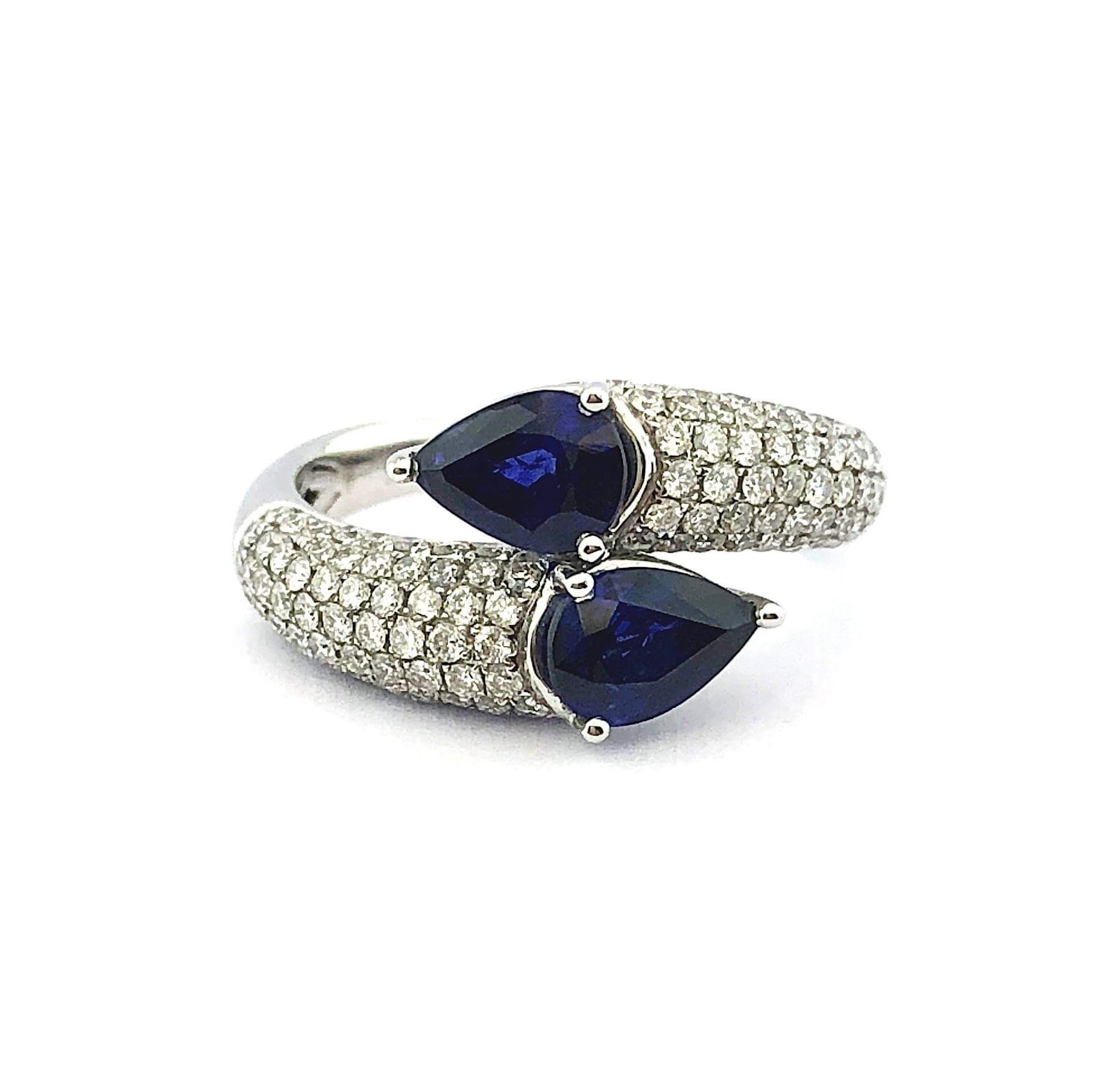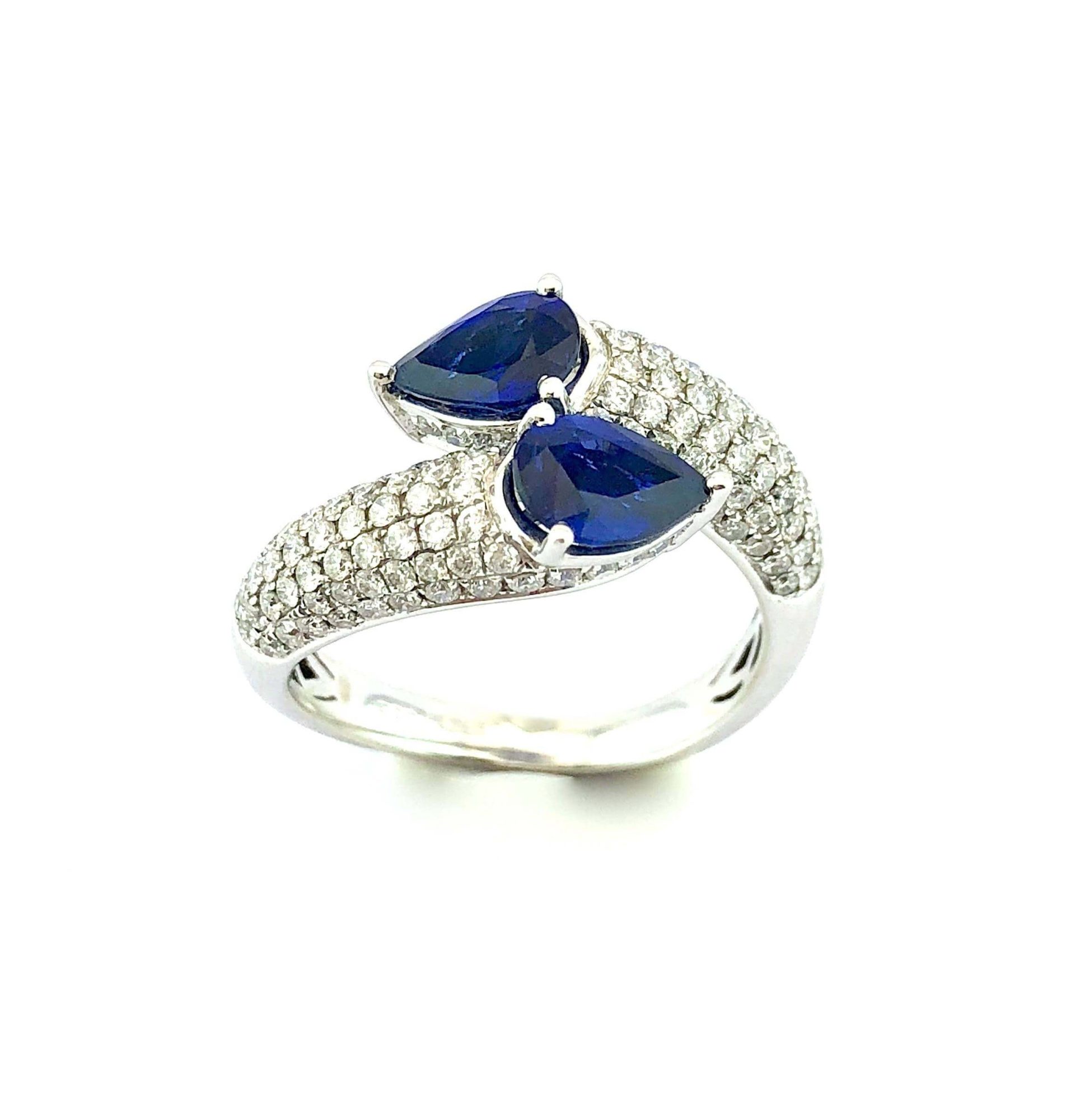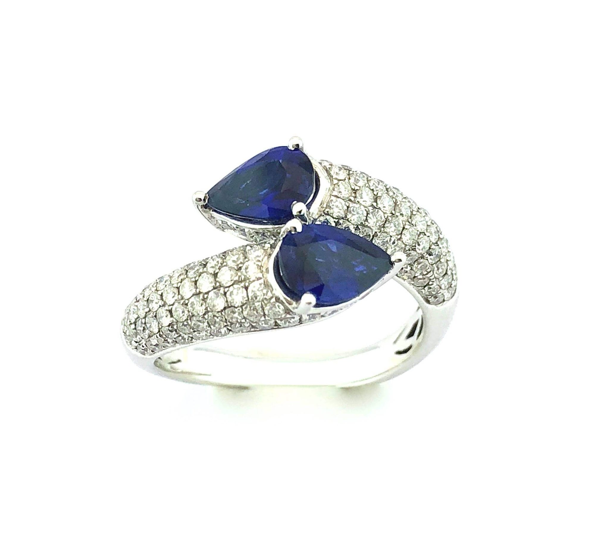Elegantiškas safyrų žiedas su dviem mėlynos spalvos lašo formos safyrais, kurių grožį paryškina 140 deimantų sudėtu į lankelį. Nepakartojamas šedevras, žavintis aukšta kokybe ir prabanga.