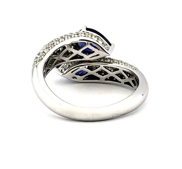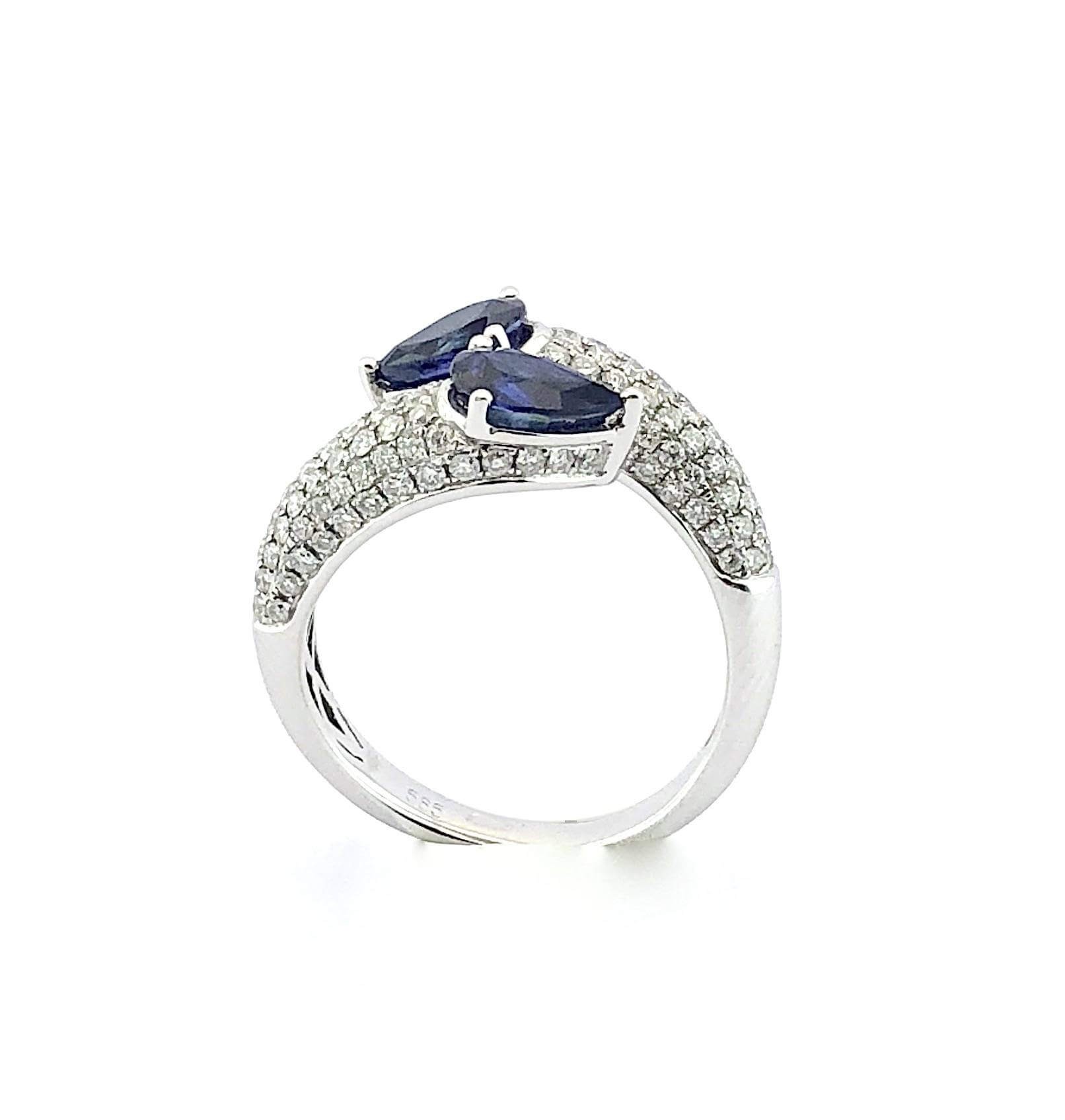 Elegantiškas safyrų žiedas su mėlynais lašo formos safyrais su 140 deimantų sudėtu į lankelį.