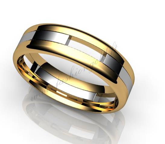 Originalaus dizaino rankų darbo vestuvinis žiedas, kuriame kontrastuoja baltas ir geltonas auksas. Vestuvinius žiedus kūrė “Fashion Gold” kompanijos juvelyrai. Šį vestuvinį žiedą galima pagaminti iš šių metalų bei prabų: aukso 585, 750.
