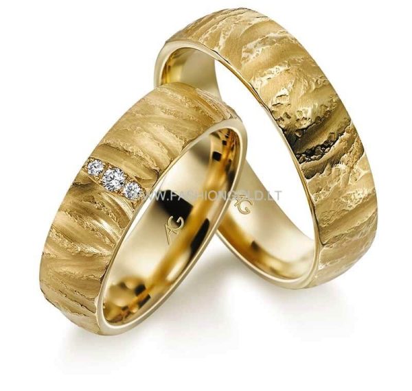 6 mm storio klasikinių formų, bet neįprasto paviršiaus geltono aukso moteriškas vestuvinis žiedas su trimis aukštos kokybės deimantais (0,045 karatai). Grublėtas paviršius primena akmenuoto kalno paviršių, todėl tai visad primins, kad jūsų meilė yra visa ko viršūnė.