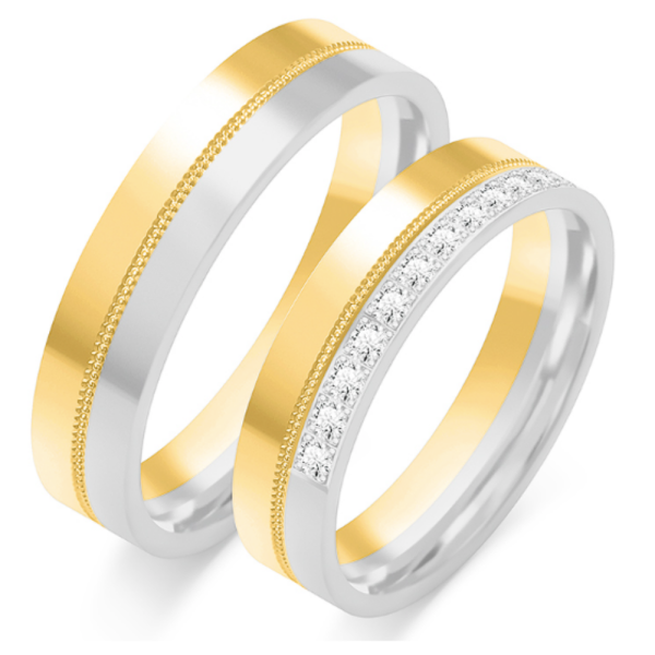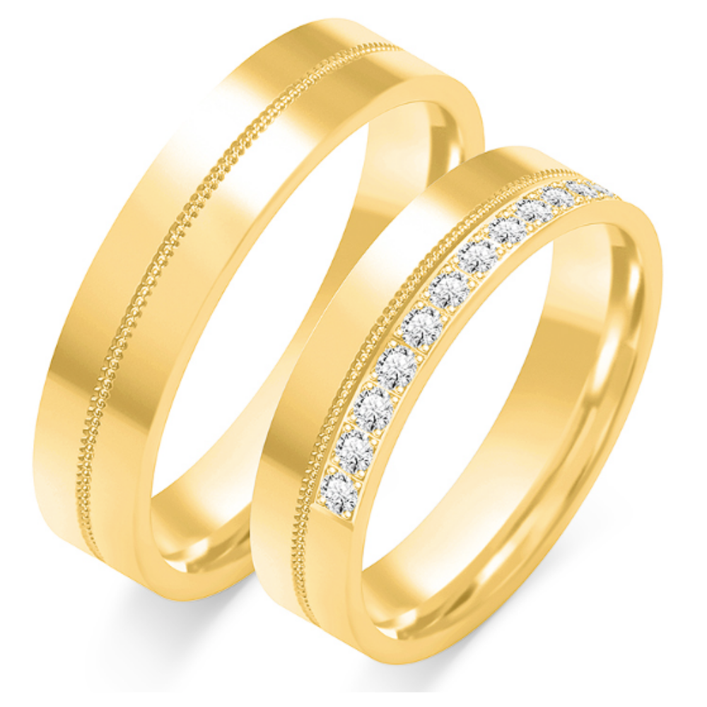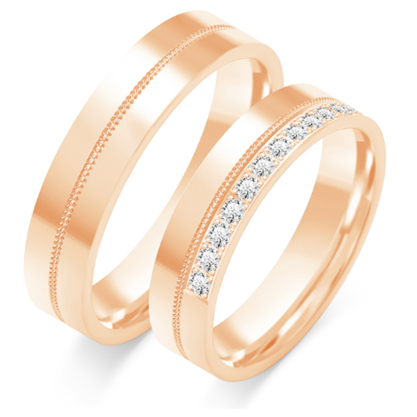 Nepakartojamo grožio vestuviniai žiedai išskirtinio stiliaus, aukštos kokybės, su komforto zona. Puikus pasirinkimas, atspindintis jūsų meilės istoriją. Jų technologija išsiskiria – vestuviniai žiedai gaminami iš grūdinto aukso, kuris atsparus mikro įtrūkimams, neturi sudėtyje nikelio bei mažiau braižosi. Žiedai gali būti pagamintas pagal užsakymą: raudono, geltono bei balto aukso, už papildomą mokestį su kitos aukso spalvos krašteliais, skirtingu žiedo pločių arba su deimantais.