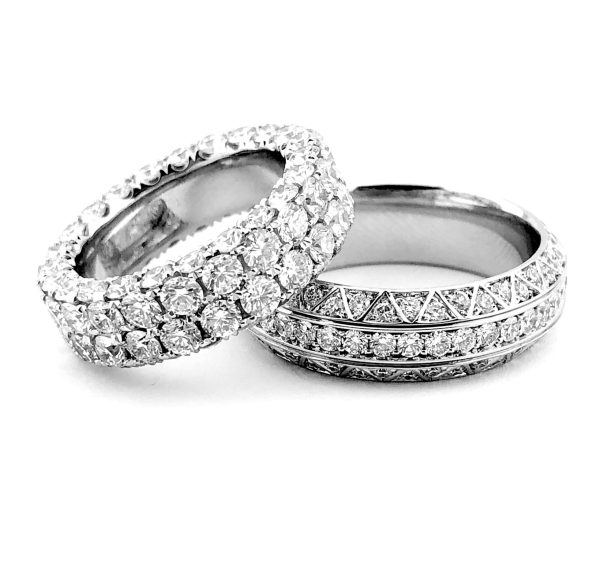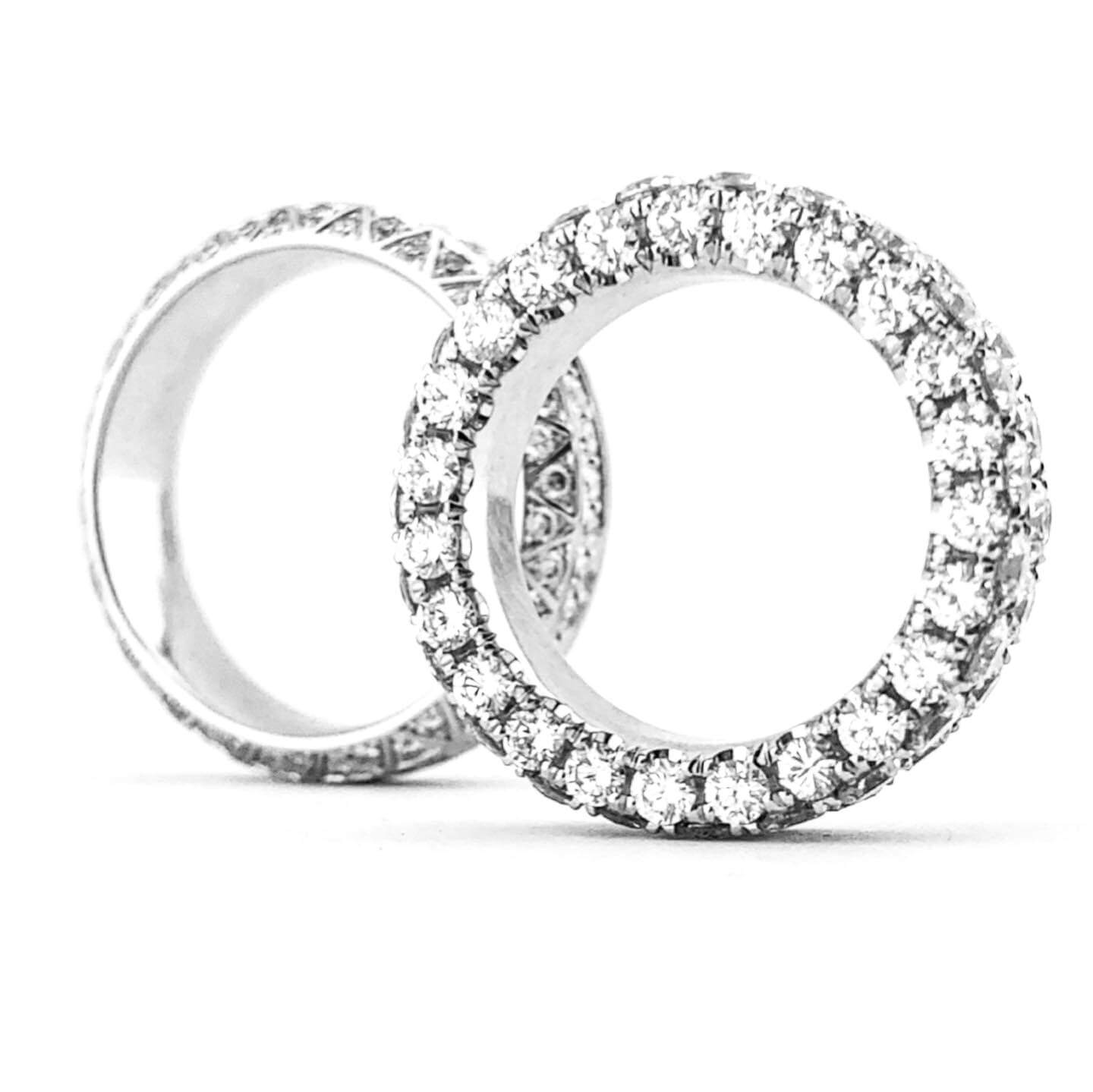 Vestuviniai žiedai su briliantais – įspūdinga prabanga ir elegancijos šydas. Moterims skirtas vestuvinis žiedas, inkrustuotas per visą perimetrą besitęsiančia briliantų eilute, sukuria ypatingo rafinuotumo ir solidumo įspūdį. Gamybos trukmė 14 d.d., galime pagaminti skubos tvarka per 3 d.d.