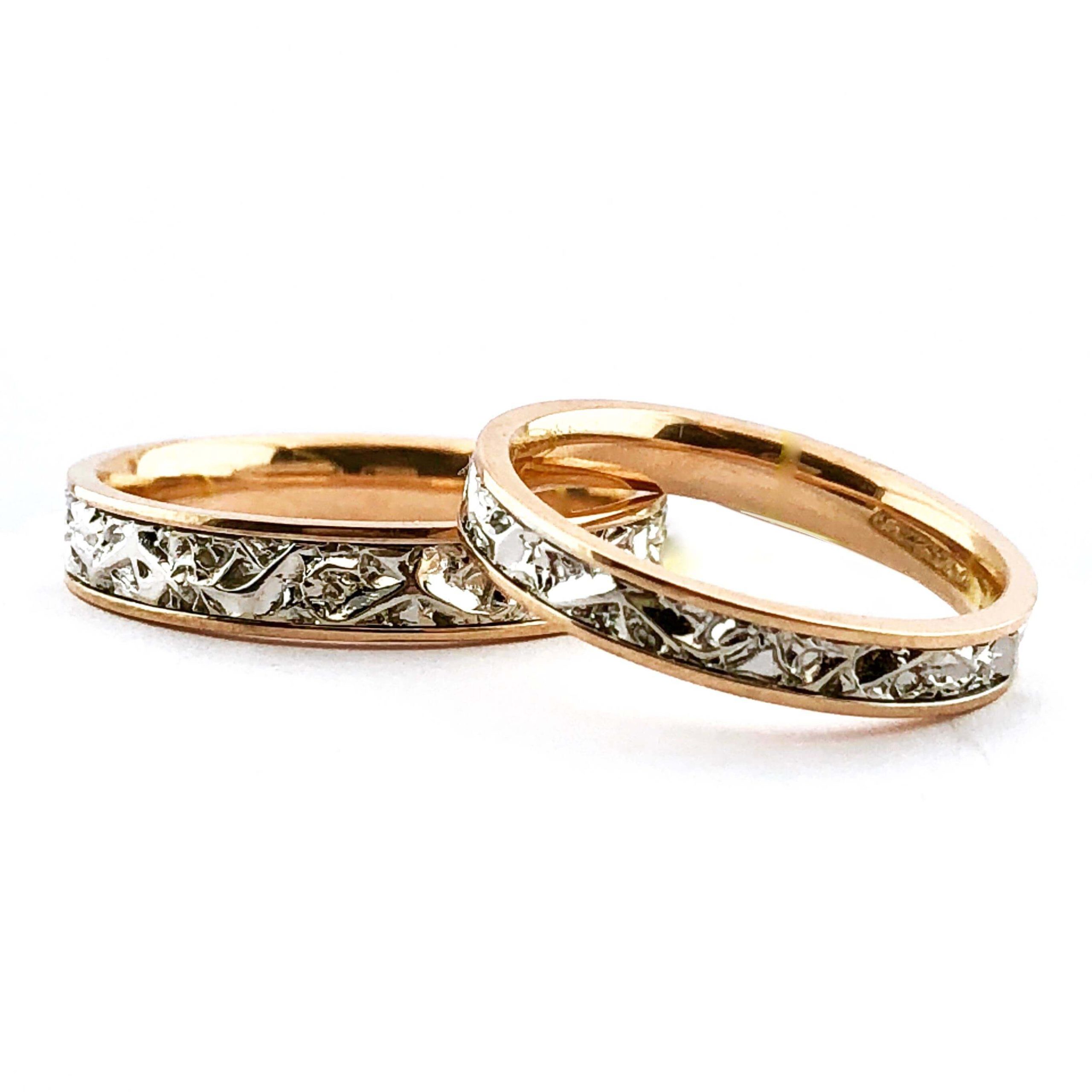 Rausvo aukso vestuviniai žiedai su išraiškinga, balto aukso juostele. Klasikos ir originalumo derinys, tobulai tinkantis moterims ir vyrams. Auksas visada madingas, tad ilgalaikėje perspektyvoje žiedai bus stilingi. Gamybos trukmė 14 d.d., galime pagaminti skubos tvarka per 3 d.d.