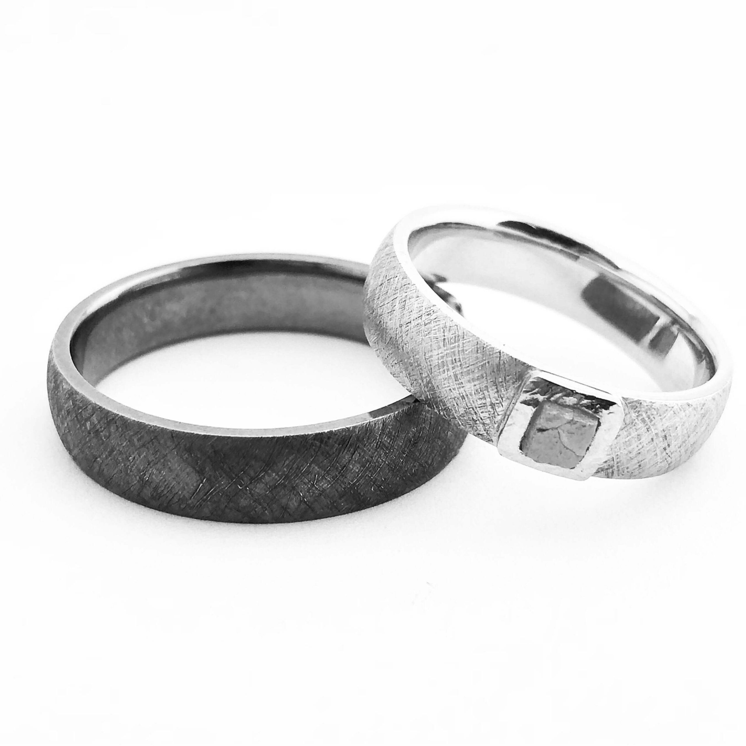 Abu žiedai turi tarsi šiurkštų, kiek matinį, nelygaus paviršiaus reljefą. Vyriškas žiedas juodos spalvos aukso, moteriškas – sidabriškai pilkas, su unikaliu neapdirbtu deimantu. Šie vestuviniai žiedai atrodo labai solidžiai, bet drauge minimalistiškai ir subtiliai. Gamybos trukmė 14 d.d., galime pagaminti skubos tvarka per 3 d.d.