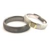 Abu žiedai turi tarsi šiurkštų, kiek matinį, nelygaus paviršiaus reljefą. Vyriškas žiedas juodos spalvos aukso, moteriškas – sidabriškai pilkas, su unikaliu neapdirbtu deimantu. Šie vestuviniai žiedai atrodo labai solidžiai, bet drauge minimalistiškai ir subtiliai.