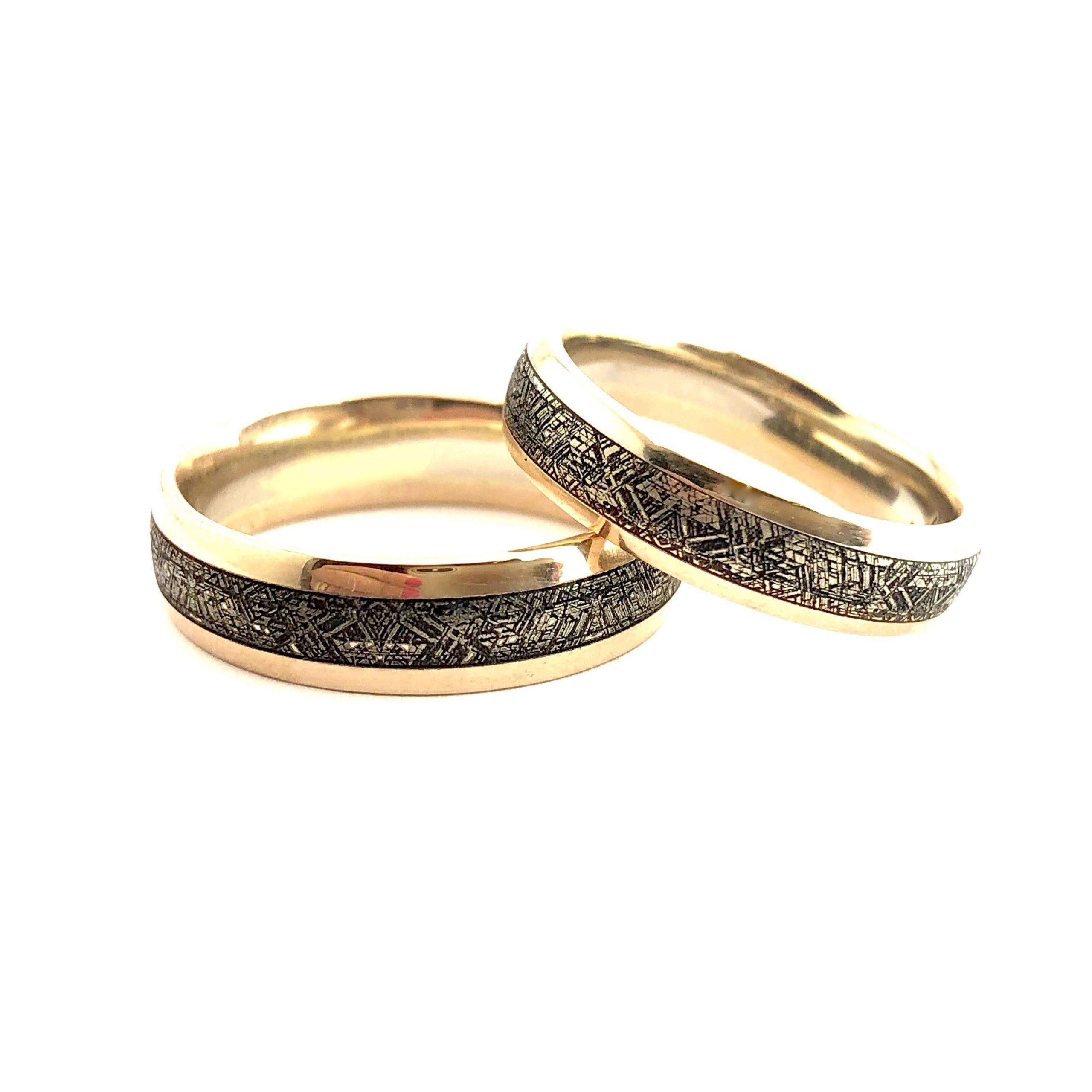 Auksiniai vestuviniai žiedai Vilniuje – ieškantiems klasikos, bet drauge trokštantiems šio to išskirtinio. Raudono aukso žiedai išsiskiria subtiliu kontrastu, atsirandančiu dėl tamsios, nelygaus graviruota reljefo juostelės, juosiančios žiedus per visą perimetrą ir priminanti meteoritą.