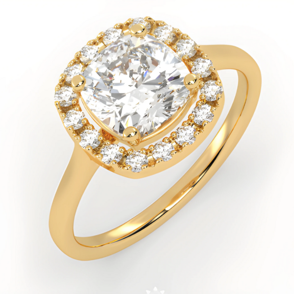 Halo dizaino žiedas su 2.00 karatu Cushion deimantais. Aukštos kokybės, rankų darbo, išskirtinis dizainas – modernus, spindintis, idealiai tiks jūsų išrinktajai